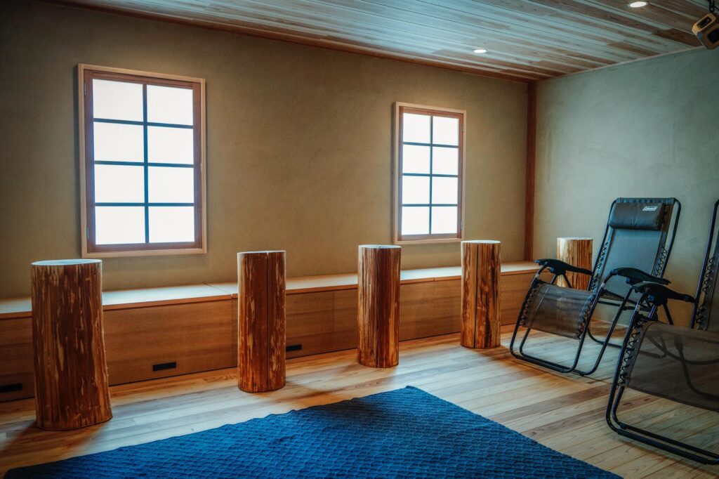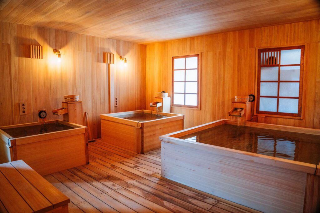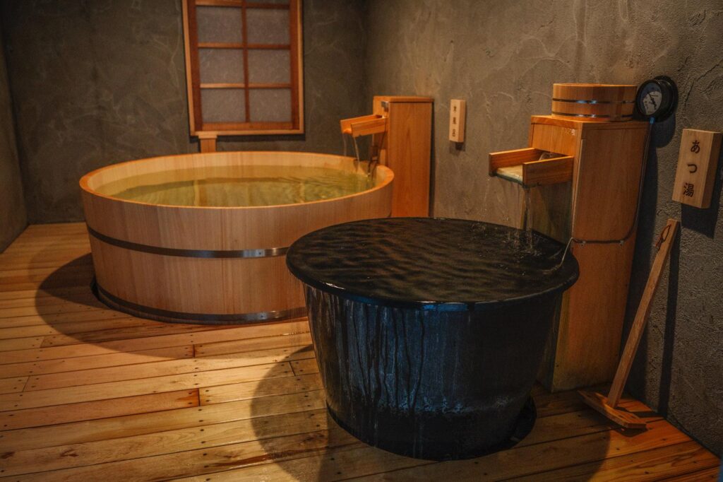 男性風呂では、45度の熱湯と水風呂を交互に利用する「西式温冷浴」を推奨。さらに洞窟風呂の空間には熱湯と大きな水風呂があり、外気浴に加えて広い内気浴スペースも設けた。温冷浴から休憩までの導線も特徴となっている。