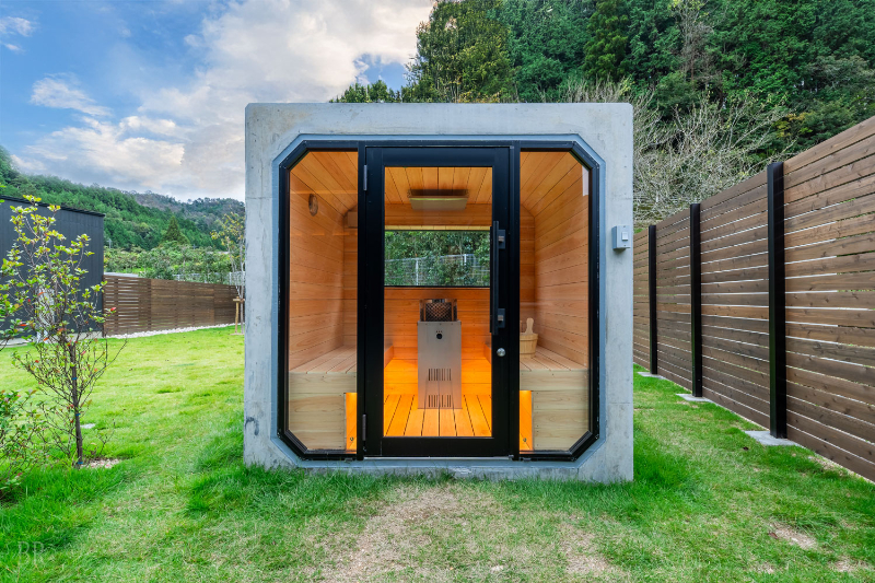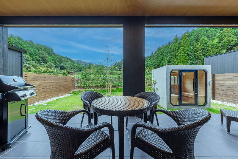 全国でも珍しいコンクリート製のプライベートサウナを全棟に完備。他の宿泊客を気にすることなく、静かな空間で心と体をととのえるサウナ体験を楽しむことができる。愛犬がくつろぐ姿を眺めながらととのう時間は、日常を忘れる特別なひとときだ。