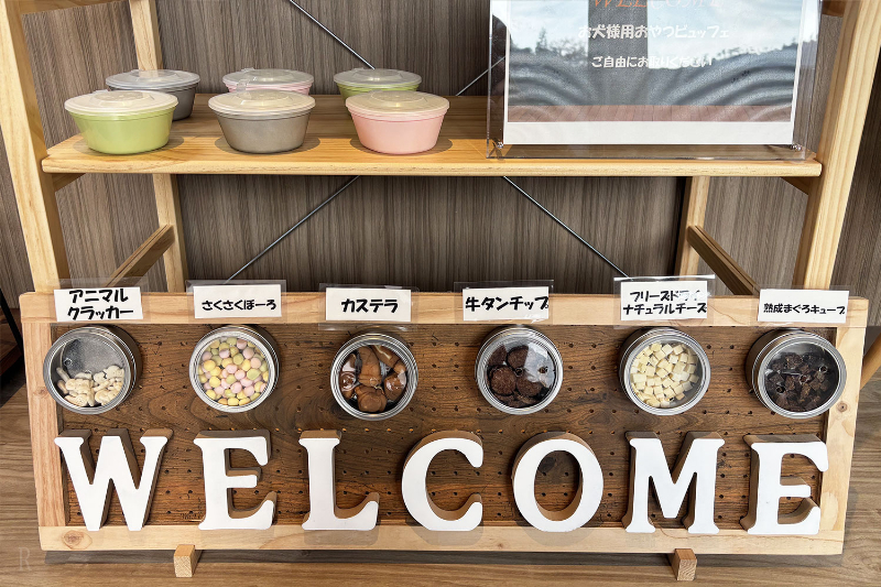 管理棟には、愛犬用のおやつを揃えた「おやつマルシェ」も。すべて無料・食べ放題で、匂いを試せるテスター付きのため、愛犬の好みに合わせて選べるのも嬉しいポイント。滞在中のちょっとした楽しみが、愛犬旅の思い出をより豊かに。
