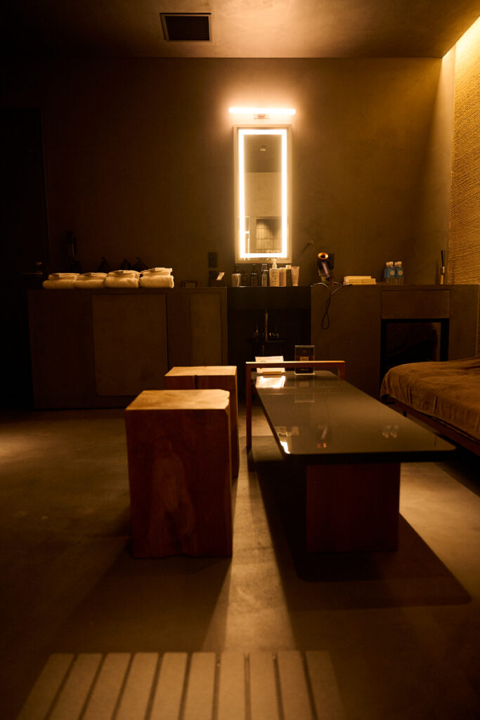 扉を開けると、グレーの壁とシンプルなインテリアでまとめられた、ミニマルな空間が広がります。ルーム内にはソファやテーブル、冷蔵庫、洗面スペースも完備。「MAMA BUTTER」など、気遣いの感じられるアメニティーにもテンションが上がります。
