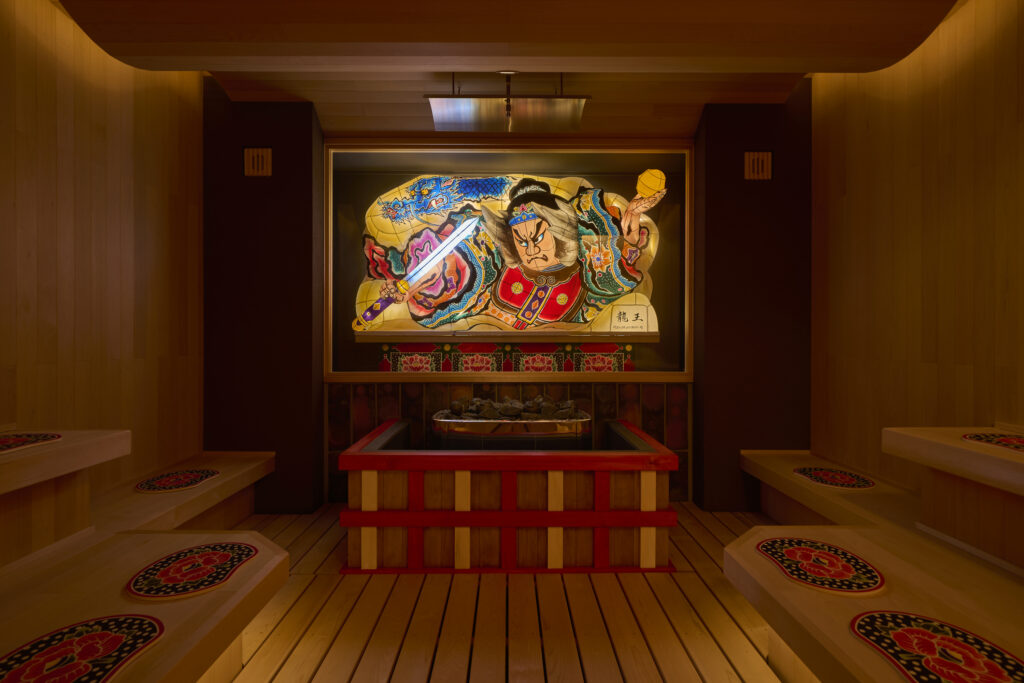 サウナヒーターは、フィンランド発祥の世界的サウナ&スパブランド「HARVIA」製を採用。囲いには、青森ねぶた祭の山車を曳く際に握る持ち手をイメージした紅白のデザインを施し、山車が目の前に迫るような臨場感を演出する。サウナ内には祭囃子が流れ、その盛り上がりに合わせてオートロウリュが作動。熱と蒸気が一気に押し寄せ、ねぶた祭さながらの熱気を体感できる構成となっている。