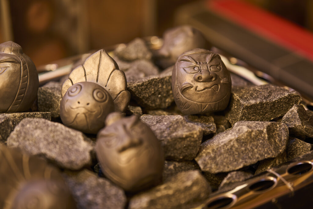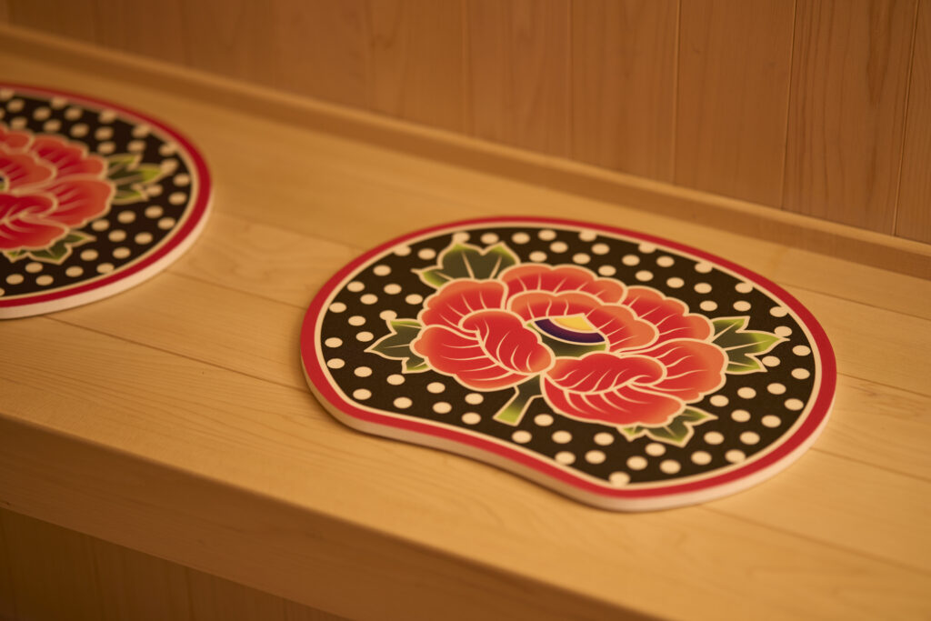 サウナマットには津軽藩の家紋や牡丹の花をモチーフにした柄を用い、12分計には祭りを盛り上げる「跳人(はねと)」の姿をデザイン。さらに、ねぶたの武者や、夏の風物詩「金魚ねぷた」をモチーフにしたサウナストーンなど、細部まで青森ねぶた祭尽くしの世界観で統一されている。
