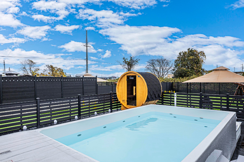 本施設には、充実したSPA設備も用意。自然に包まれた空間で楽しめるサウナや、大型のプライベートジャグジーも完備。ジャグジーは、水風呂としてはもちろん、夏にはプールとしても利用できる。愛犬との旅に、飼い主自身の癒やしとぜいたくも添えた滞在を。