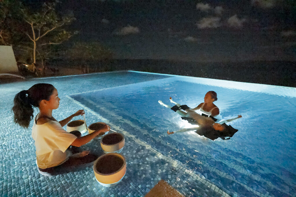 8月に誕生したクワイエットプールは、冬季はホットプールとして運営いたします。さらにクワイエットプールを活用した新たなアクティビティとして、プールに浮かびながらクリスタルボウルの倍音を浴びる「ナイトフローティングサウンドバス」が開始された。