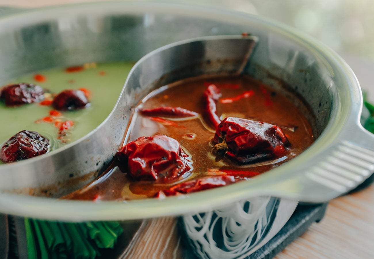 2種のオリジナルスープで見た目も華やかな「薬膳火鍋」は、和食割烹「酒井商会」の酒井シェフ監修。ボタニカルグリーンのとろりと濃厚な緑白湯には、魚介の旨味たっぷりの蛤や赤エビ、千葉・鴨川のハーブ園「苗目ファーム」などから届くフレッシュなハーブを入れて、シメにはジャスミンライスで薬膳粥をいただける。ピリッと辛い黒胡麻麻辣スープにはラムや鶏肉、シメにはフォーを楽しむことができる。