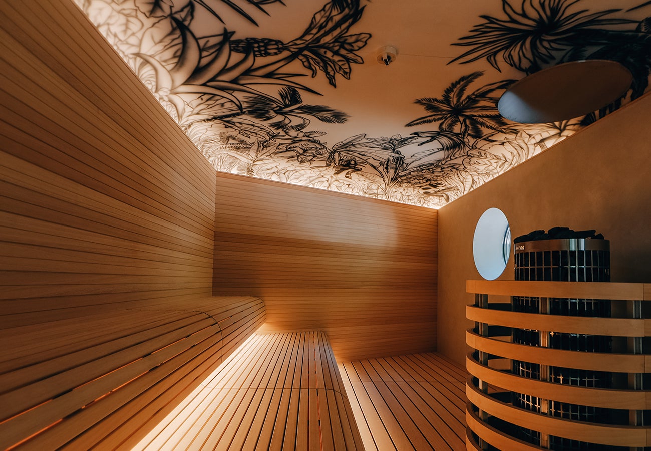 天井にはジャングルをイメージしたアートが描かれ、心地よいBGMとともにサウナを楽しめる「SWEAT LODGE」。「HARVIA」のサウナストーブではセルフロウリュも可能で、水風呂&温浴ジャグジーが付いている。
