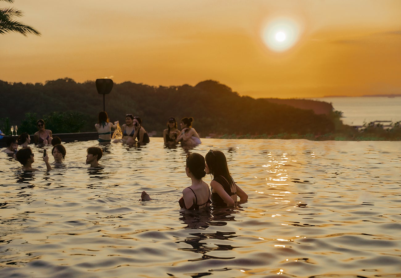 「BPC」は、宿泊者のみが利用できるプールクラブをテーマに、ユニークな植物に囲まれた空間で、緑あふれるサウナ体験と屋外温水プールをオールシーズン楽しむことができるホテル。「HOT POOL」は、温かいプールに入りながら、日中は東京湾越しの美しい富士山を、夕刻は水平線に沈む夕日を眺め、夜は満点の星空の下で心身を癒せる新感覚の温水プールだ。