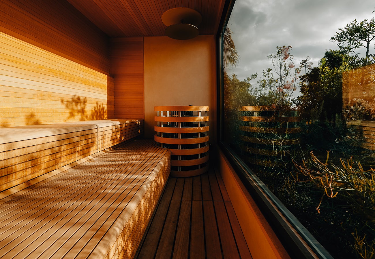 「SWEAT BOX」は、セルフロウリュ付きのプールサイドに設置されたボックスサウナ。全面ガラス張りの大きな窓からは、生い茂る多様な植物を眺めることができる。