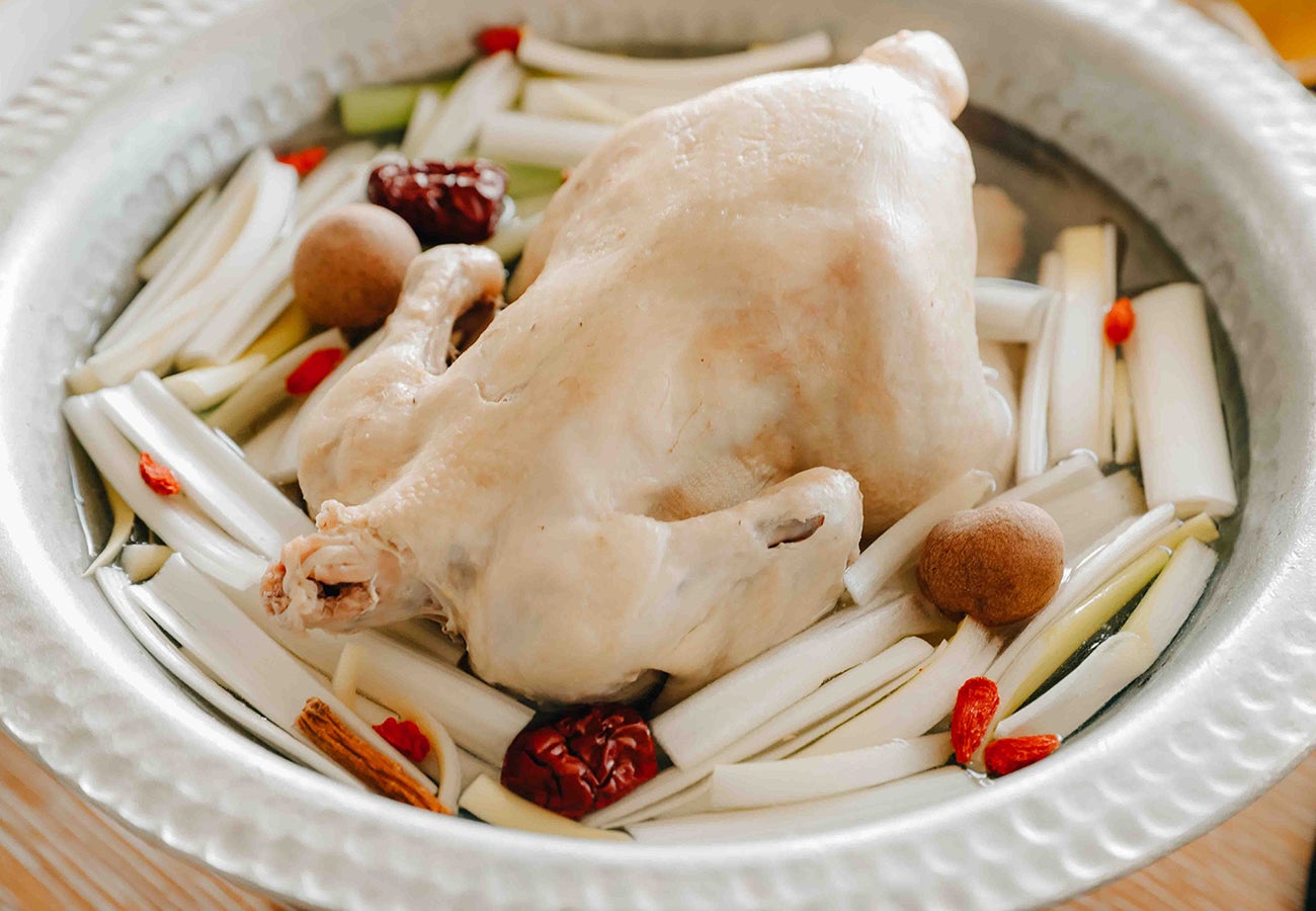 ひな鳥をまるごと一羽使用し、中国人参、くこの実、龍眼などの薬膳と黒胡椒が効いたスープが身体を温めてくれる「薬膳タッカンマリ」。自家製のタテギ(韓国風味付けみそ)、酢、だし醤油、マスタードなどの薬味を加えることで、多彩な味わいを楽しむことができる。シメには、鶏の出汁がたっぷり溶け込んだスープに合わせた太麺をご用意します。