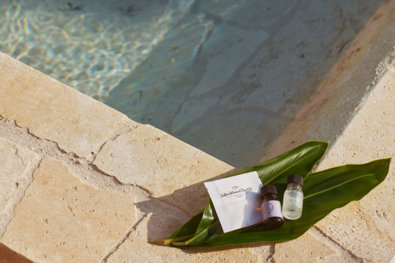 バレルサウナで温まった後は、琉球石灰岩を用いた水風呂へ。背もたれ付きの水風呂からは海や空の絶景が広がり、冷水浴後は海上に設置された外気浴チェアで海風と波の音に身を委ねる時間を味わえる。体験後には、月桃由来のスキンケアアイテムで肌を整えることができる。