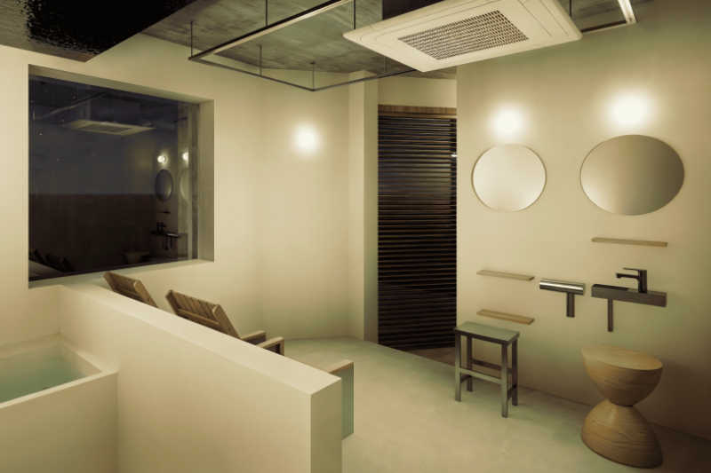 サウナ室内にシャワー設備を備え、温まった状態から身体を冷やす動線を確保。さらに、チラー設備を備えた水風呂を設置し、温熱から冷却までをスムーズに完結させる設計である。室内ではアメニティを使ったセルフケアも可能だ。さらに、パウダールームは利用時間外でも使用可能。