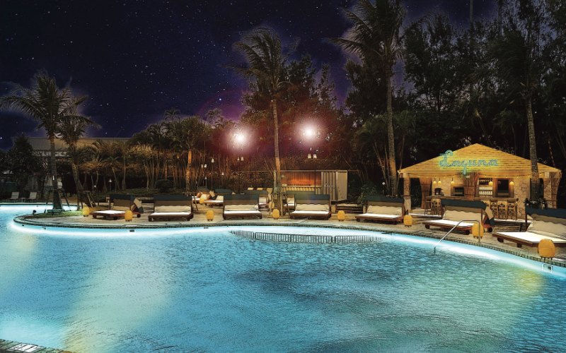 サウナやプールを満喫した後は、プールサイドバーで〆のひとときまでリゾートサウナを堪能。オリジナルドリンクや多彩なカクテルに加え、サウナ後に嬉しい「サウナめし」などのフードメニューも取り揃えられている。さらに、夜にはホテルロゴのネオンライトがやさしく灯り、思わず写真に収めたくなる空間に。解放感あふれるリゾートサウナ時間を過ごすことができそうだ。