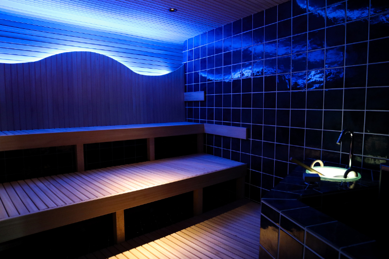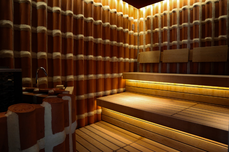 男性浴室にあるサウナ室は、沖縄の伝統的な建築物に使われている「赤ガーラ(赤瓦)」をイメージした、落ち着いた赤を基調とした空間。温もりと力強さを感じるデザインで、心身ともにリフレッシュできる。