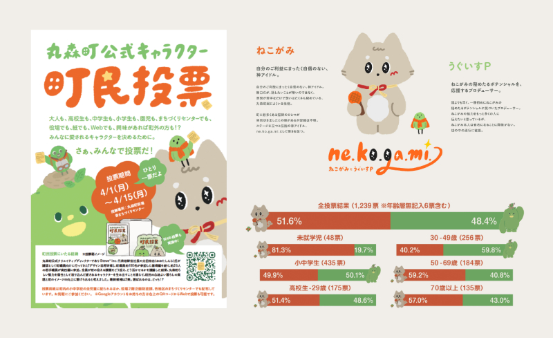 そんな、研修の実践編として制作されたキャラクター案は、町政史上初となる全世代対象の町民投票によって選出された。園児や小・中学生を含む投票の結果、「ねこがみとうぐいすP」が公式キャラクターとして誕生した。