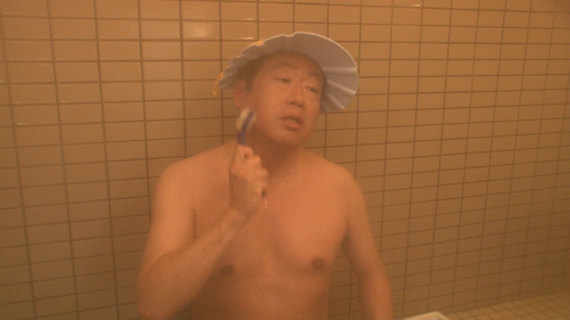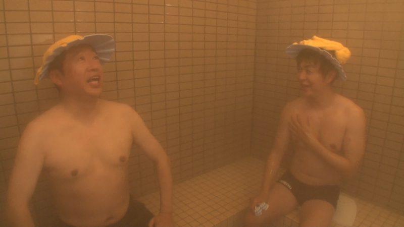 一見、何気ない銭湯かと思いきや、サウナ室に入るとまるで豪雨!?のような超強力のミストサウナが。5分として入れる人がいないほどのアチアチということで、その豪雨に備えるため2人はシャンプーハットを被りおちゃめな表情。