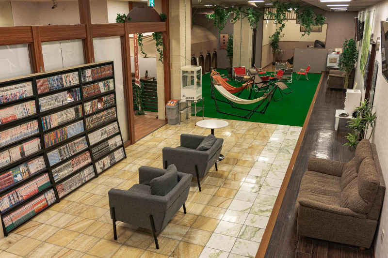 さらに、休憩ラウンジにはコミック約3,000冊を揃え、テラス席も。休憩ラウンジ内には、ドクターフィッシュやマッサージ機、ゲームコーナーなどもあり、一日中滞在できる施設となっている。