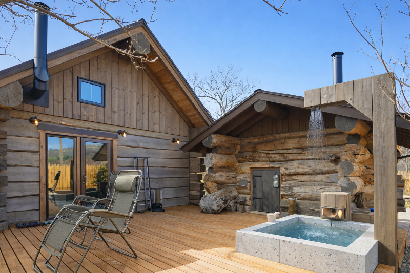 新設されたプレミアムログコテージの特徴は、敷地内に専用のログサウナを備えた一棟貸しだということ。周囲を気にせず、自分たちのペースでサウナ時間を組み立てられる。