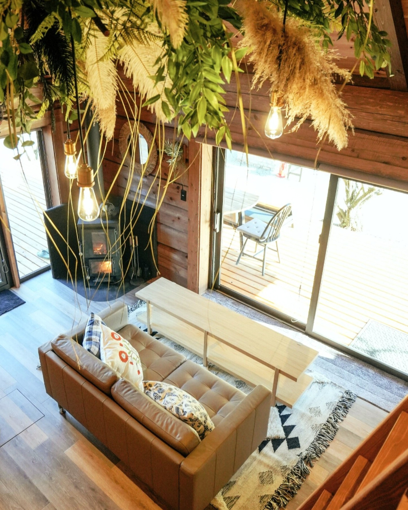 室内は大きな窓から荒神山の自然を望む開放的な設計である。昼は自然光、夜は薪ストーブの炎を囲む穏やかな時間を過ごすことができる。