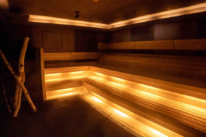 天井部には星空をイメージした照明が瞬き、北欧の夜を思わせるゆったりとした雰囲気を演出します。「我慢」ではなく「心地よさ」を感じながら長時間くつろげるサウナ室となっている。