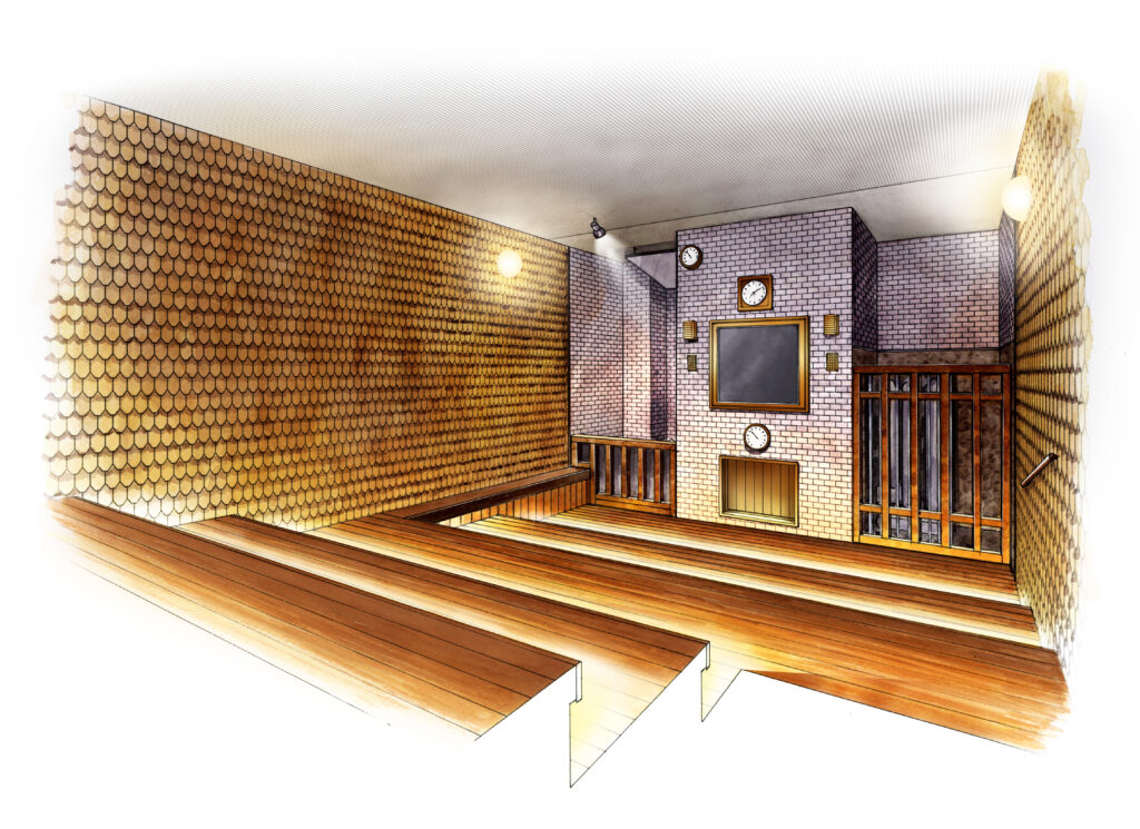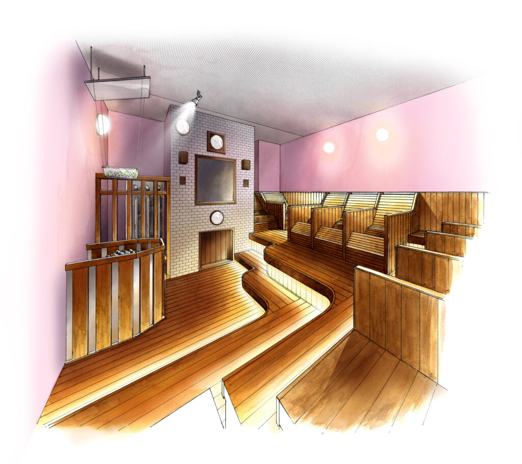 アウフグースイベントにも対応するスタジアム型サウナとして、迫力ある蒸気と熱波を体感できる空間とする。