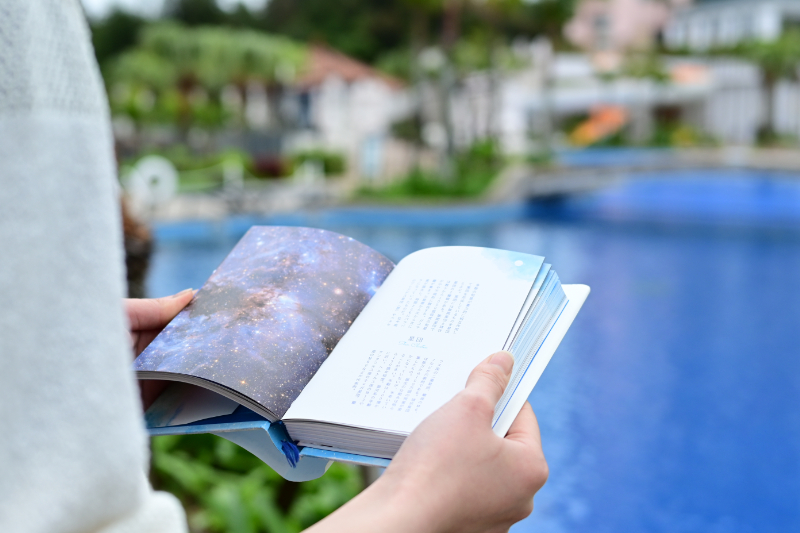 プールエリアには、今帰仁村の「はなうた書房」がセレクトした本を設置したガゼボ(東屋のようなもの)を用意。旅や沖縄に関する書籍がそろい、サウナ後の休憩や読書に活用できる。