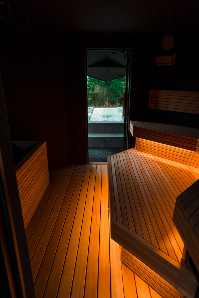 阿蘇の伏流水を贅沢に使用した水風呂と、カルデラの景色を存分に感じられる開放的なサウナ室を完備。水風呂では、冷たく澄んだ伏流水に浸かりながら心身をリフレッシュでき、サウナでは大きな窓や開口部から自然の風景が視界いっぱいに広がり、温まりながら阿蘇の大地と空気が体感できる。