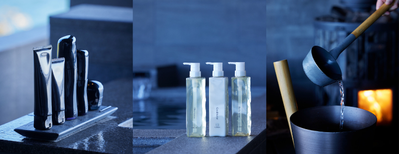貸切り薪サウナ付きスパでは、「B.A」のスキンケアラインや、ホテルアメニティーブランドの「IUGEN」を体験できるほか、「B.A」の世界観をイメージしたオリジナルサウナロウリュウアロマを楽しむことができる。