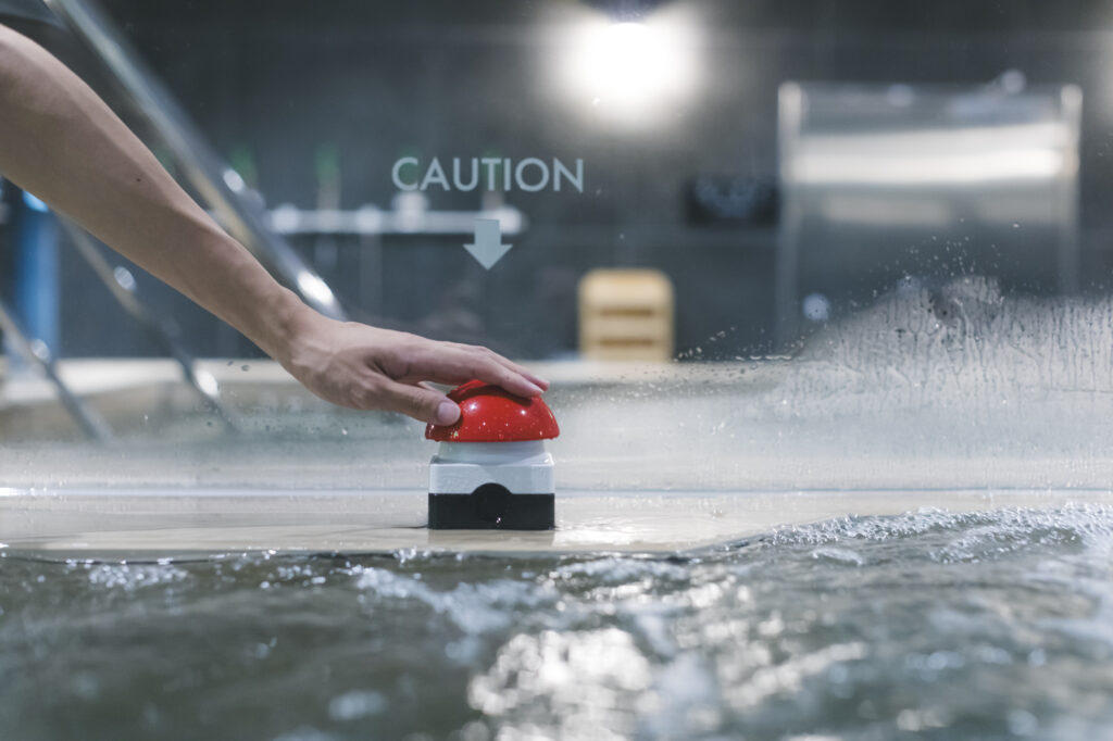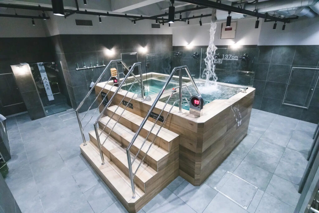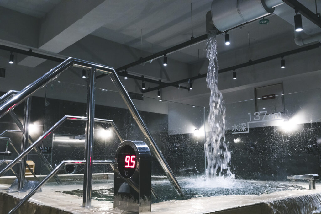 「クロスカウンター」は、ボタンを押すと四方からジェットが噴出し、さらに頭上から毎分250Lの冷水が降り注ぐ。水温10℃未満のシングル仕様かつ、水深1.37mの深め設計で、全身をしっかりクールダウンすることができる。