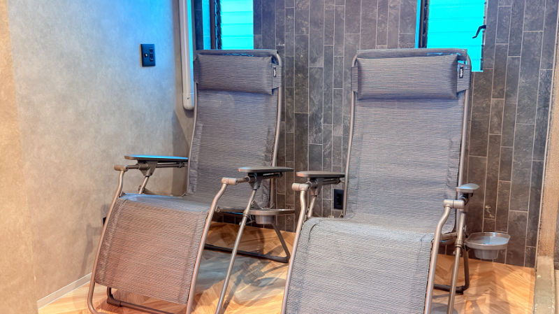サウナ利用時の休憩には、フランスのアウトドア家具ブランド「Lafuma Mobilier(ラフマ モビリエ)」のリクライニングチェアーを導入。身体をあずけた瞬間に重力から解放されるような感覚、まるで宙に浮いているかのような感覚を味わうことができる。
