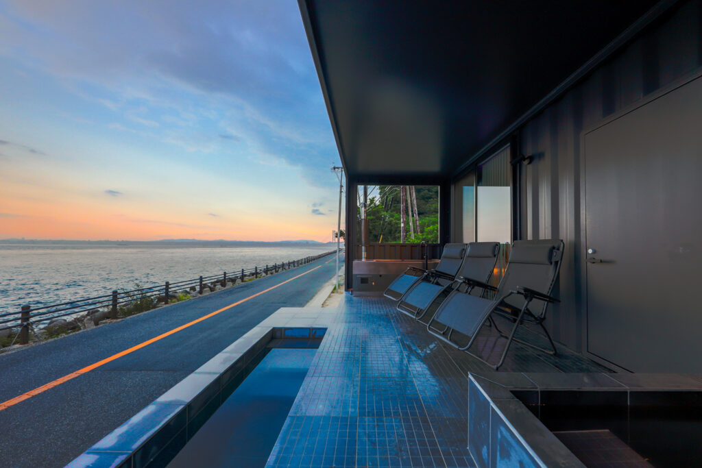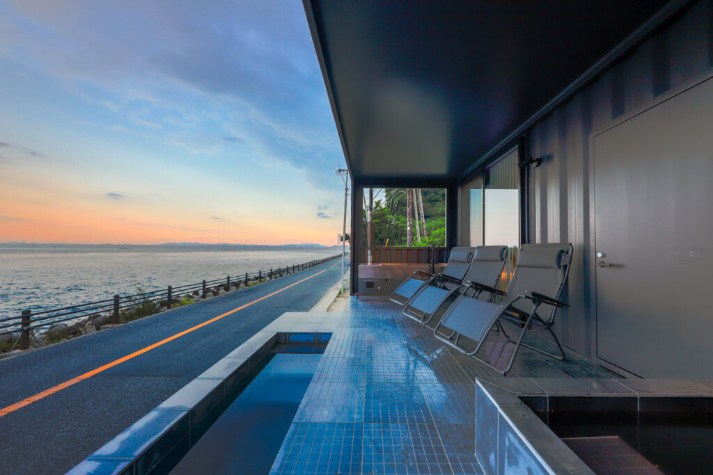 プールサイドには全天候型デイベッド、焚火バスタブ、BBQセットを完備。夕陽・海・サウナが一体となる“大人の隠れ家”が演出される。