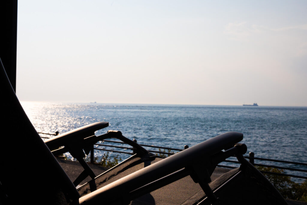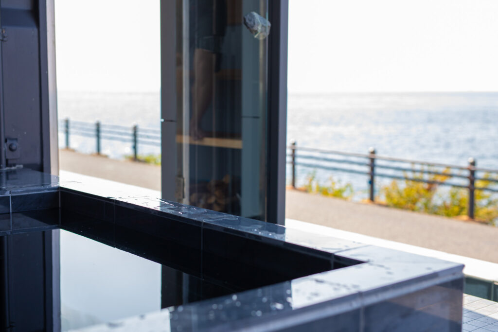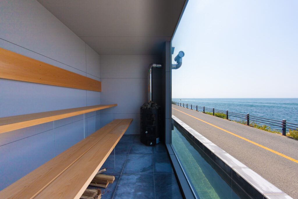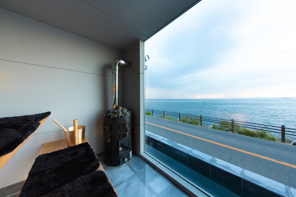 遮るもののない海景をガラス越しに望むサウナ室では、刻々と変わる空の色と光を感じながら、自然との一体感を味わえる。