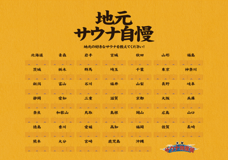 会場の壁には、全国47都道府県がずらりと並んだ特設ボードが登場。サウナマット風カードに地元の好きなサウナを書いて飾ることができる。