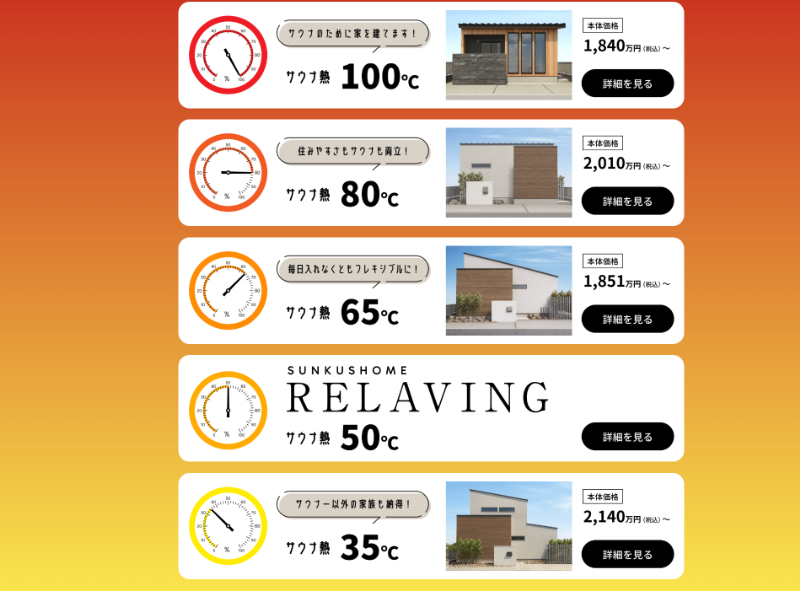 SAUNiEは「お気に入りのサウナと暮らす毎日」をコンセプトにしたサウナ付き住宅ブランドである。サウナへの“熱量”に応じて、4つのプランを用意している。