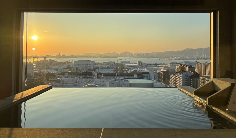 上層階クラブフロアにビューバス付の客室が新たにオープン。ビューバスからは、神戸港と神戸市街地、そして壮大な六甲山の美しい稜線まで一望でき、昼はやわらかな陽光に包まれた開放感、夜は、“1,000万ドルの夜景”とも称される神戸の街の煌めきを地元・灘五郷の日本酒風呂に浸りながら楽しむことができる。