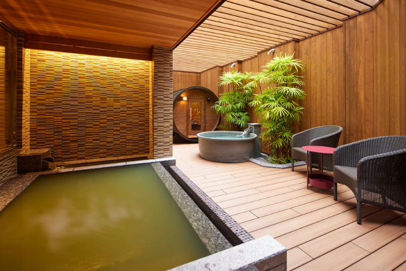 ホテル敷地内の地下1,600mから湧き出る自家源泉・神戸六甲温泉「濱泉」内にプライベートサウナがオープン。広々とした屋外デッキテラスにロウリュ対応のバレルサウナ、水風呂が設置され、ゆったりと外気浴まで楽しむことができる。露天風呂では源泉かけ流し天然温泉のぜいたくな湯浴みを満喫可能。完全プライベートな空間で日頃の疲れを癒やし、身体も心もウェルビーイングなひと時を提供する。(宿泊者限定・予約制)
