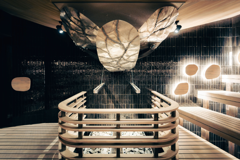 さらに、自社開発のアロマオートロウリュウ装置では、高所からシャワー状にアロマ水を放出し、サウナ室全体へ香りを豊かに広げる。光に照らされて降り落ちる水の煌めきは、視覚的な心地よさも演出。これらの技術とデザインが融合することで、音・香り・熱が繊細にめぐる“深い没入空間”となっている。