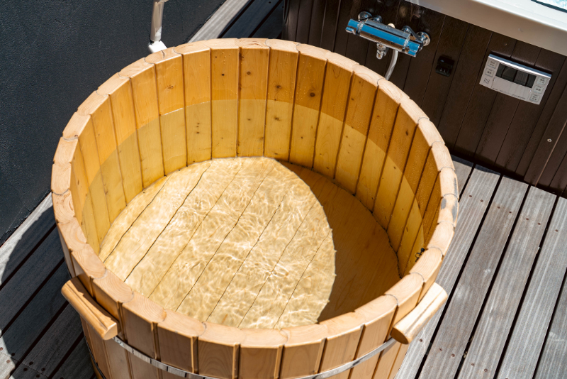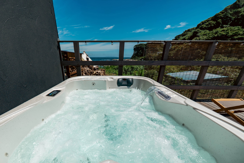 プライベートサウナに隣接して、全棟に温水ジャグジーも。オーシャンビューを眺めながら湯に身を委ね、非日常感のある体験を。