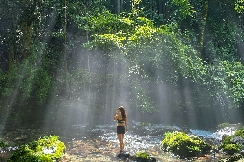 苔むした岩、土の香り、川のせせらぎ、木々の揺らぎ、鳥の声が五感を優しく刺激。まるで、もののけ姫や屋久島のような神秘的な自然の光景に癒やされる神聖で特別な空間だ。
