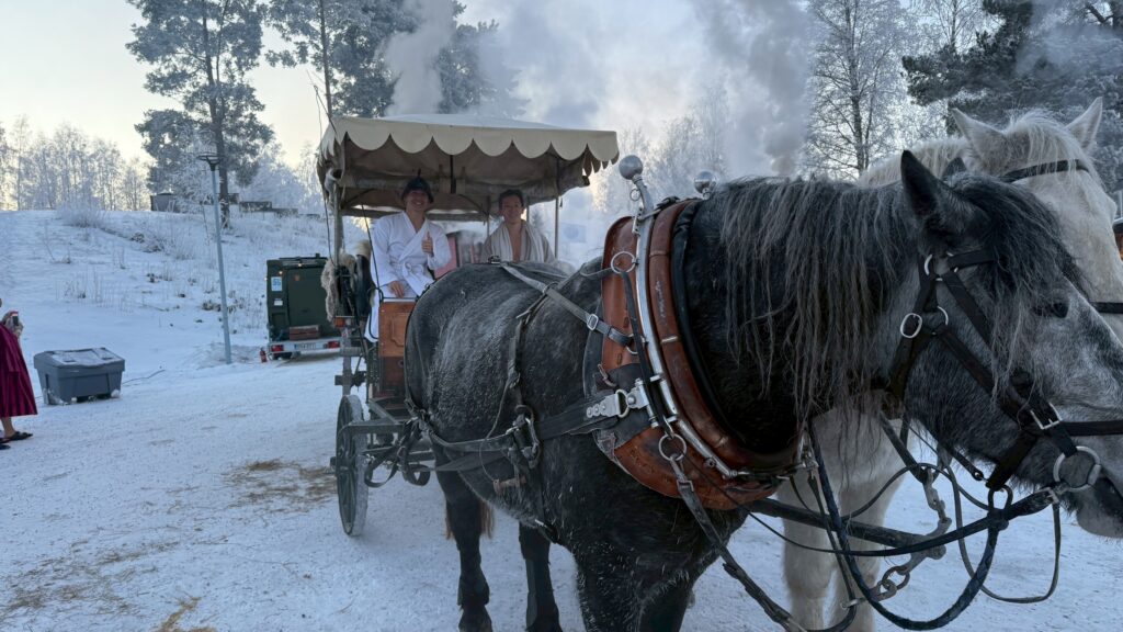 冬のフィンランドのサウナといえば凍った湖のアヴァントだが、このお祭りの楽しみはもうひとつあった。馬車に乗って湖の上を爆走する。これが絶景と共にぜいたくな、忘れられない体験のひとつになったことはいうまでもない。