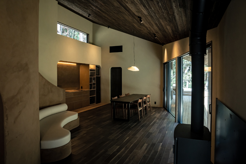 最大7名まで宿泊できる一棟貸し形式で、プライベートサウナ、水風呂、外気浴スペースを備える。森の空気の中で身体を整え、浴室からは森林と四季の移ろいを感じながら入浴できる。冬季でも暖かく過ごせる薪ストーブも設置し、炎を見つめ“思考をほどく体験”を。