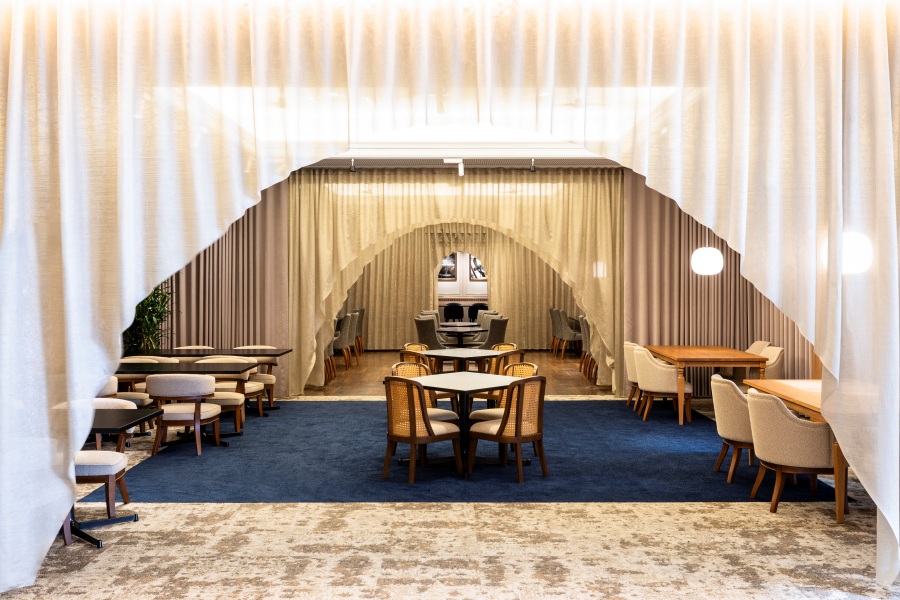 レストランは、かつての大宴会場の一部とフロントを改修し、メインダイニングとして再生した。名称は旧レストラン棟で親しまれてきた「松濤」を継承。地産地消を軸に、地元食材やドリンクを取り入れた食体験を提供する。空間面では、アーチ状のカーテンや照明計画を通じて、クラシックホテルらしい気品とモダンな軽やかさを両立させた。