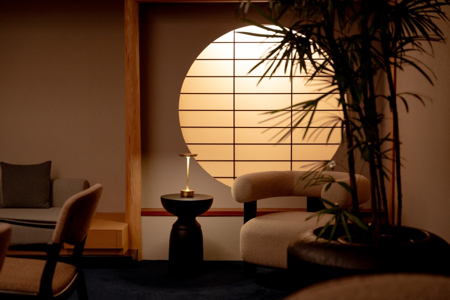 あわせて、大浴場まわりの体験価値向上も図った。大浴場から客室へ向かう動線上には「湯上りラウンジ」を新設。既存の天井や障子、丸窓などの和の意匠を生かしながら、ソファやラウンジチェア、マッサージチェア、ドリンクを備えた上質なくつろぎ空間へと刷新した。露天風呂の外構も見直し、景色と開放感をより楽しめるようにしている。