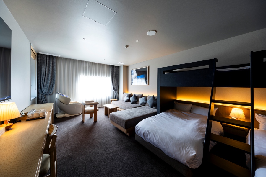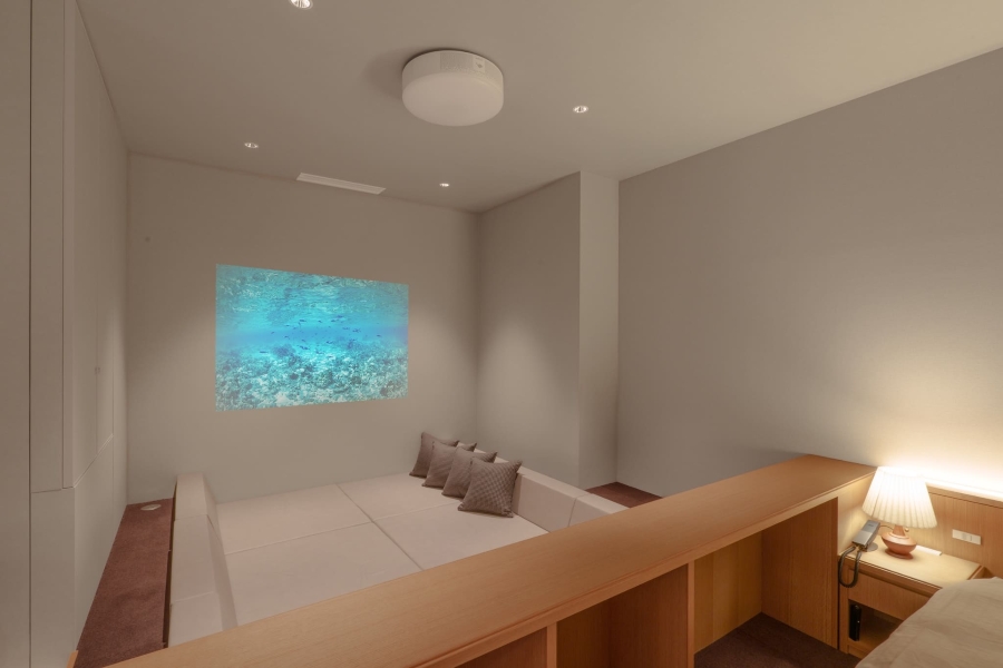 客室は全50室をリニューアル。既存客室は創業当時の面影を残しながら改修し、さらにサウナやジャグジー付きの客室を7室新設した。なかでも最大6名まで宿泊可能な「ヒーリングサウナスイート」には、プライベートサウナ、水風呂、ととのいスペースを備える。松林と海の景色を望む空間で、滞在そのものの満足度を高める設計とした。大画面スマートTVやシネマスペースも備え、おこもり旅やグループ利用にも対応する。