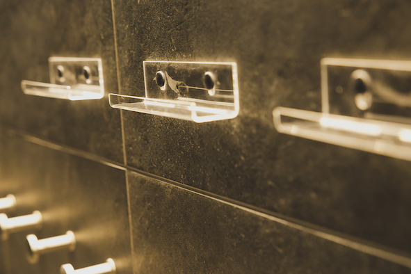 サウナハットなどを掛けられるフックのすぐそばに、物を置ける「ミニ棚」も。実はこれもめちゃくちゃ便利。掛けられないタイプのハットや、汗流しのときにメガネを外すなんて人もいますからね。いやぁ、よく考えられています。