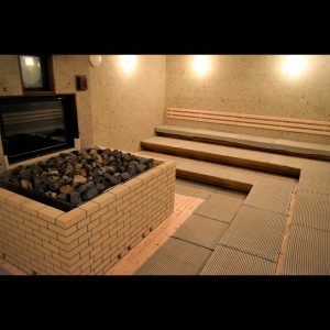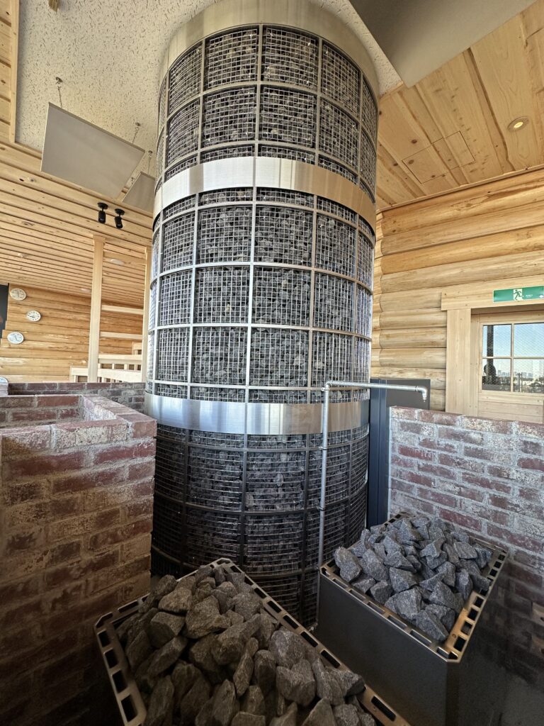このグランビューサウナは、SPA+(スパプラス)内に新設されたサウナ室。入って早々、このどでかい”ストーブオブジェ”がお出迎えしてくれるんです。実際にサウナ室を温めるのは、FinTecのストーブ4基。70〜80人収容できるサウナ室をじゅうぶんに温めてくれます。