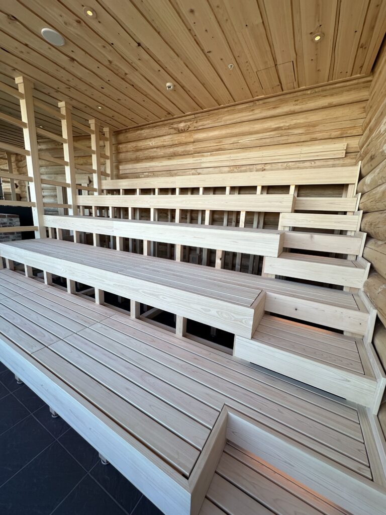 座面や床はヒノキを張り替え、さらに、1段目、2段目の座面をを少し広くすることで、ゆったりと過ごせるように。逆に、ストーブを囲う木枠や、開放感のある様子はリニューアル前のまま。リニューアルされた部分と変わらないものが混在して心地よさが増しました。