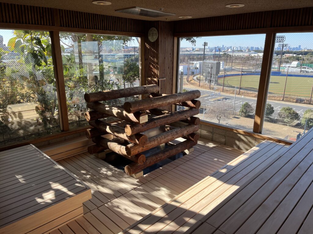 目の前には、浦安市運動公園や工場、倉庫、テーマパークなどを一望することができます。(男女共用のサウナ室で、岩盤浴着着用で楽しめます。)