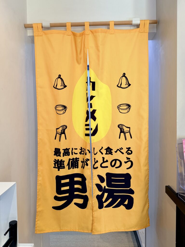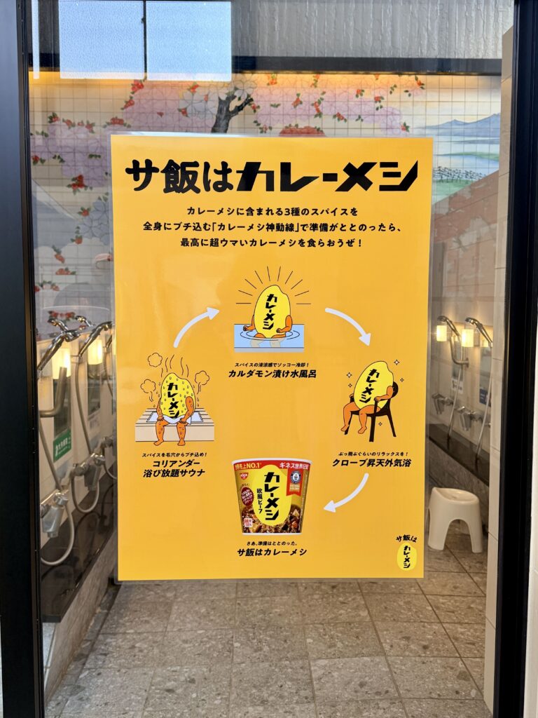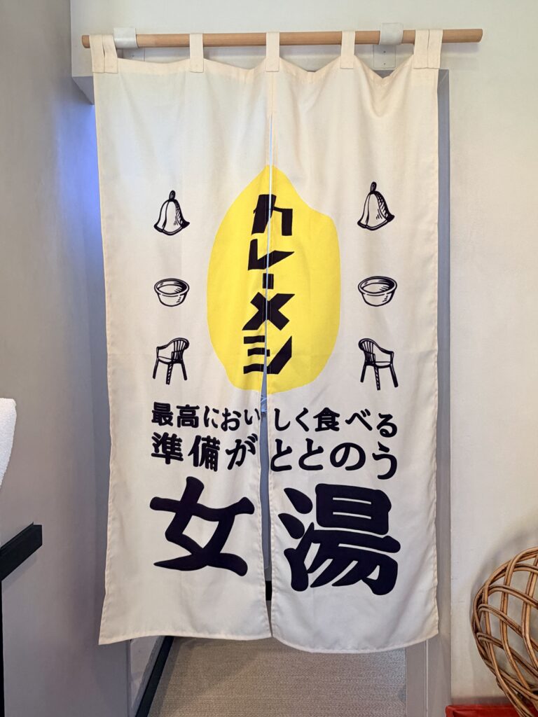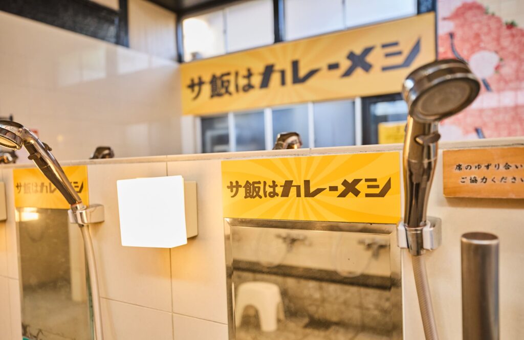 堀田湯に足を踏み入れた瞬間、まず目に飛び込んでくるのは「カレーメシ」の世界観。館内の随所にあしらわれたビジュアルが、この特別な体験への期待感を自然と高めてくれる