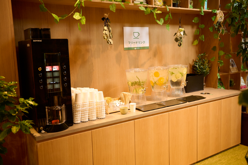 また、フロアの一角には、おしゃれなドリンクコーナーが。有料でドリンクバーを楽しめる施設は多いですが、「りんねの湯」はなんと入館料のみでデトックスウォータとコーヒーが飲み放題! デトックスウォータは3種類のフレーバーがあるので、お気に入りを見つけてみてください(お酢が入っていて体に良さそう)。