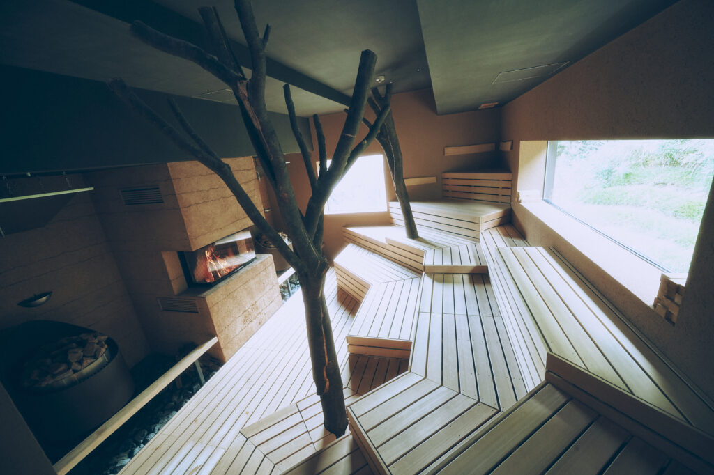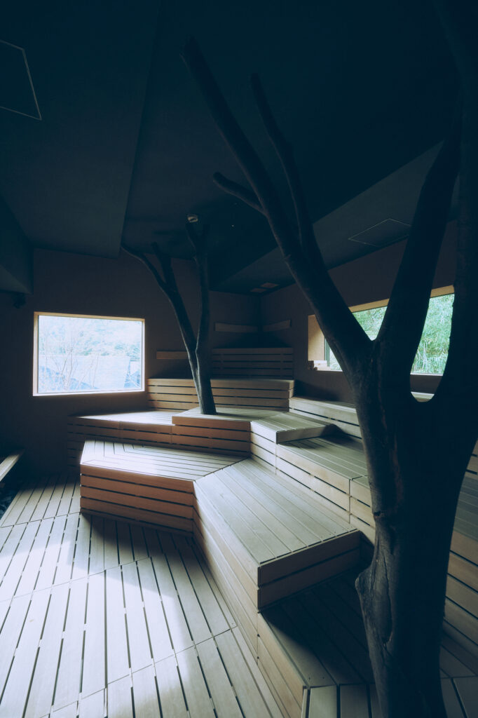 まずは、山サウナから。一歩足を踏み入れた瞬間、「これは普通のサウナ室じゃない」と直感。鼻を抜けるのは、熱に乗ってふわっと漂う天然木の香り。木材の油分が温められて立ちのぼる甘い匂いに、はやくも癒されつつ、中へ。